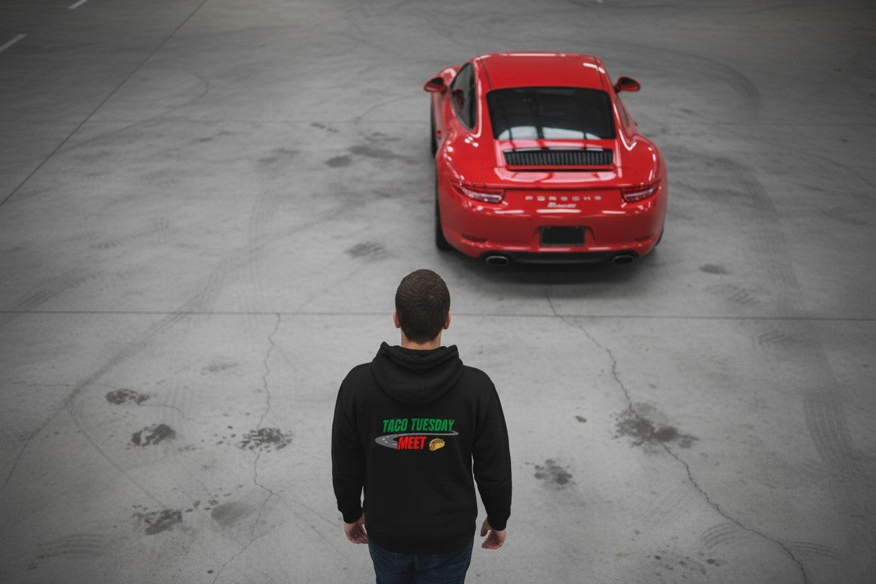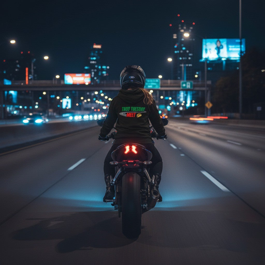 Channel your inner night-owl. This black hoodie is the perfect fit for a late-night cruise or a post-taco chill session. The vibes are immaculate, the tacos are legit, and you're officially part of the meet. This ain't just a hoodie; it's a mood.